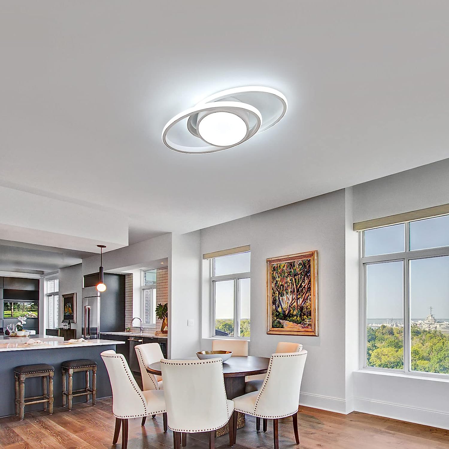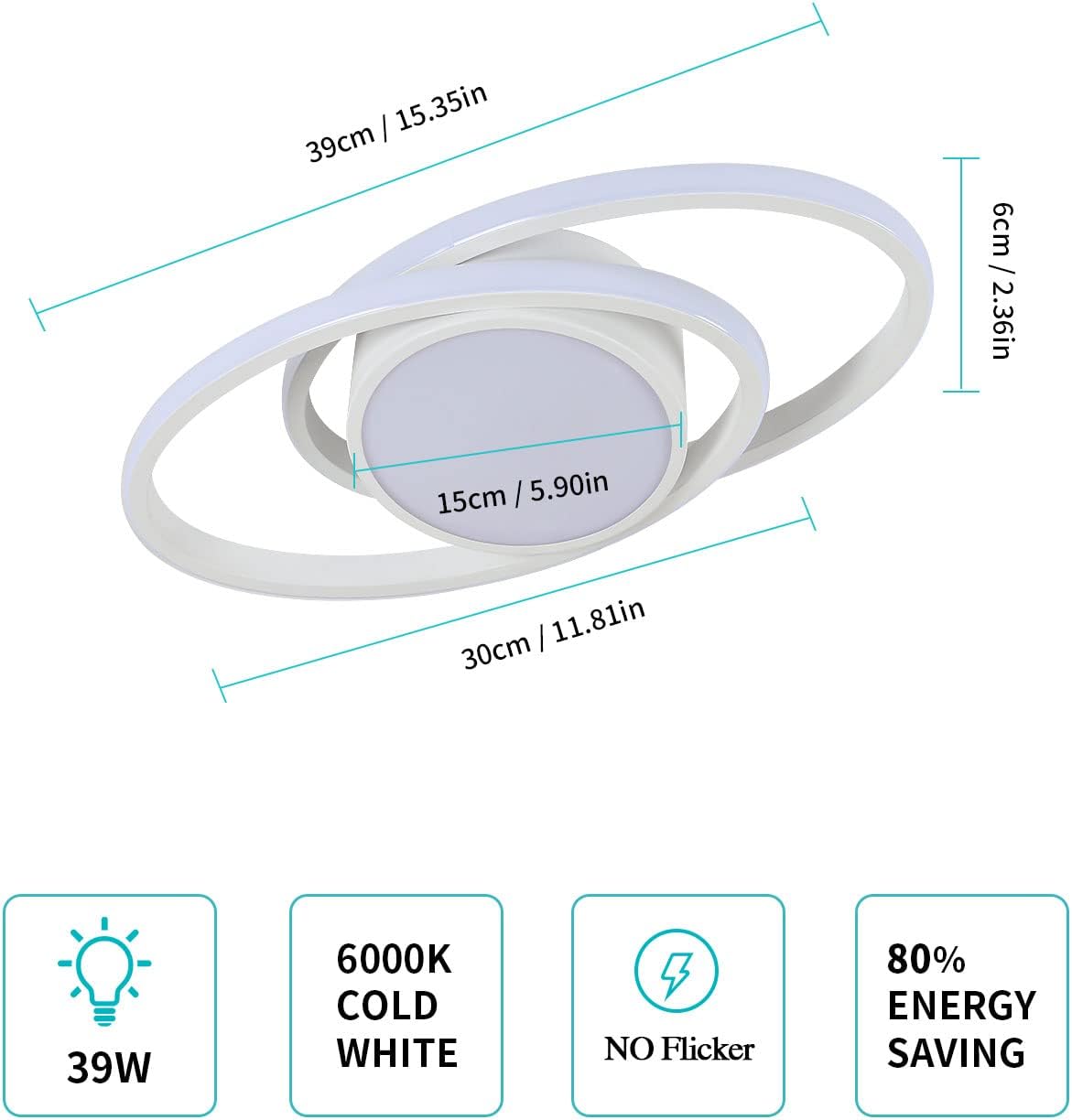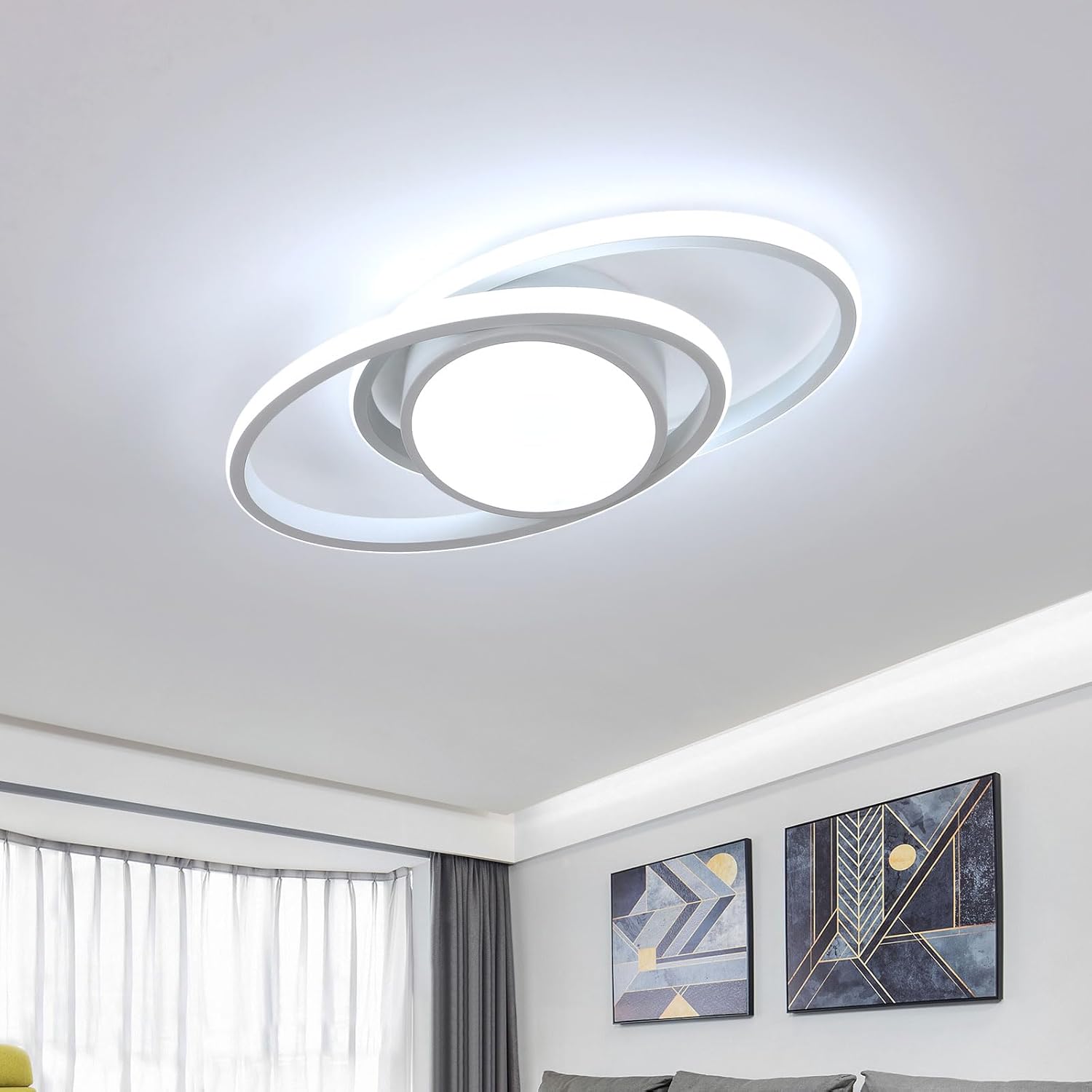 (Unique Design) The Ceiling light misst 38*17*6 cm and features over a minimalist Doubles ring-Design, the itself easy in different Interior styles integrate allows and the Room a modern Touch confers. The round Lamp body in the Middle ensures for a sufficient Light source.