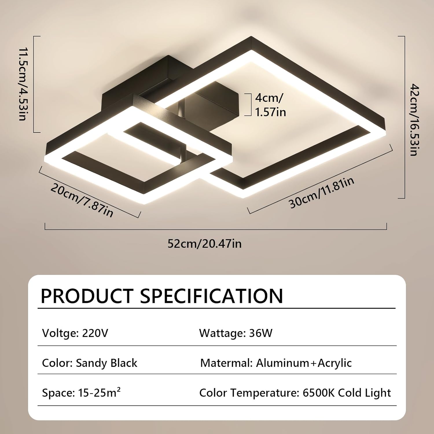 (Specifications the LED-Ceiling lamp)Dimensions: 52 x 42 x 11.5 cm, Power: 36 W, 4050 lm, Color temperature: Cool white 6500 K, Product weight: 1480 g, Area: 15???¡ì?C20 square meters. Color: White.