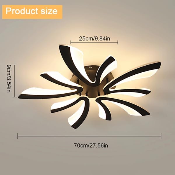 (LED ceiling lamp dimensions)Power: 48W 5400LM, color temperature: Dimmable 3000K-6500K, lamp body color: black, dimensions: Dia70*H9 cm/Dia27.56*H3.54 inches, ceiling plate: 24cm/10.63 inches, material: acrylic and iron, irradiation area: 20-30square meters, package includes: 1 x LED ceiling light, 1 x Remote control, 1 x complete installation accessory, 1 x instruction manual, voltage: 110V-240V